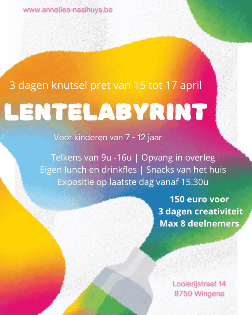 De creatieve workshops voor kinderen gaan door in het Naaihuys, Looierijstraat 14 8750 Wingene. Vooraf inschrijven is noodzakelijk en kan via mail of whatsapp. Er is een minimum van 4 inschrijvingen en maximum van 8 inschrijvingen van toepassing. Tijdens de workshop wordt water of fruitsap voorzien met een kleine versnapering.